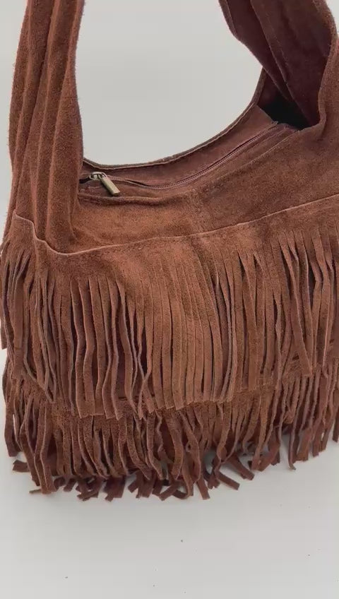 Mala estilo saco em camurça castanha Franjas decorativas, material leve e confortável ao toque Interior espaçoso com ótimo acabamento Ideal para uso diário ou ocasiões especiais Código LOKS2FCAS Preço 36€