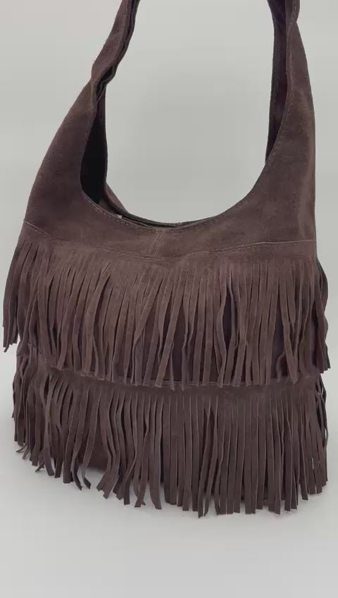Dê um toque boho ao seu visual com esta mala tipo saco cheia de charme. Confeccionada em material macio e resistente, ela traz franjas delicadas que se movimentam com naturalidade, garantindo um look moderno e descontraído.